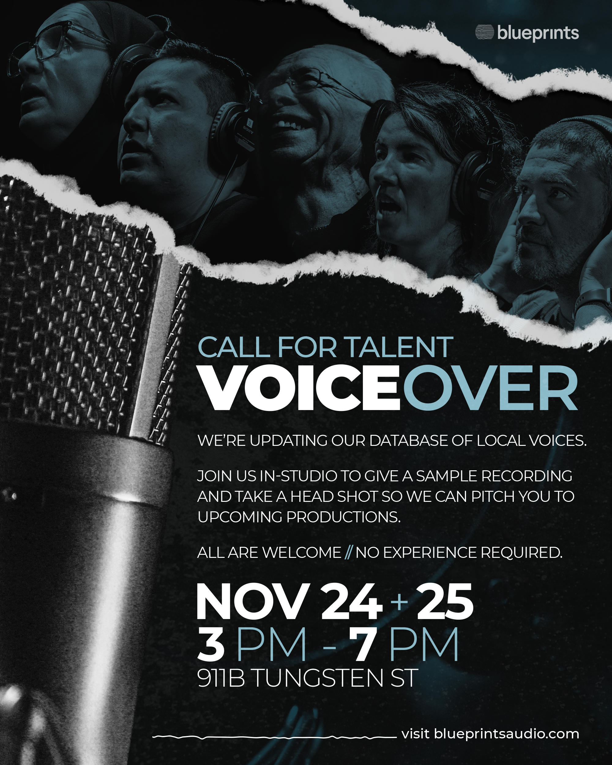 I’m unable to attend, is there another way for me to submit my work for consideration? Yes, you can email info@blueprintsaudio.com with “Voiceover Call For Talent” in the subject line with a link to a downloadable audio sample that you have the rights to, as well a head shot / promo photo.